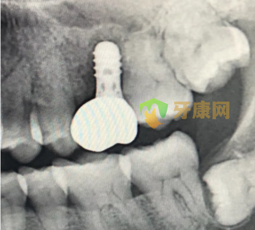 X線片示種植體周低密度影。予以拔除26牙區種植體后搔刮創面,擬擇期再行種植修復。