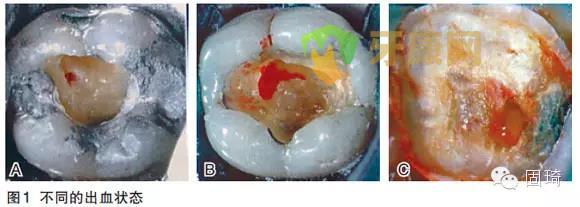 判斷牙髓狀態是關鍵,只有術前診斷牙髓狀態正常或牙髓尚未出現不可復性牙髓炎的患牙,才有保存活髓的可能性。臨床觀察表明,活髓保存療效較好的病例,其牙髓狀態應滿足以下條件:①患牙術前無自發痛,溫度測驗正常;②臨床及X線檢查均無根尖周異常;③露髓孔小,創面出血鮮紅、量少且易止血。如圖1中A圖所示,露髓處有少量鮮紅血,直接蓋髓預后較好;B、C圖所示露髓處有較多血性滲出甚至膿性滲出,則應考慮根管治療(圖1摘自第5版Problem Solving in Endodontics)。